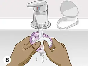 - Waschen Sie das Diaphragma mit warmem Wasser und Seife und spülen es gut ab. Lassen Sie es danach an der Luft trocknen. Bewahren Sie es in einer geeigneten Box auf.