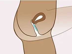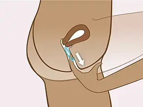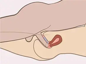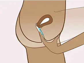 - Schieben Sie den Ring in der Scheide nach oben. Sie können den Ring in verschiedenen Positionen einführen, zum Beispiel indem Sie im Stehen ein Bein hochstellen, sich hinlegen oder hinhocken.