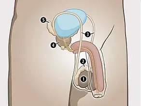 Männer haben zwei Bläschendrüsen (5). Sie sind mit den Samenleitern verbunden. Auch die Bläschendrüsen produzieren eine Flüssigkeit, die sich mit den Spermien vermischt.