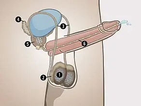 • Die Spermien werden durch die Samenleiter (3) zu den Bläschendrüsen (4) und zur Prostata (5) transportiert. Dort vermischen sie sich mit verschiedenen Flüssigkeiten zu Sperma.